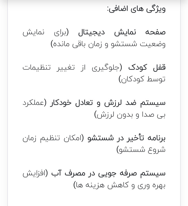 | سایر توضیحات | دارای 15 برنامه شستشو -سیستم بالانس خودکار - شستشوی سر یع 18 دقیقه- آبکشی اضافه |